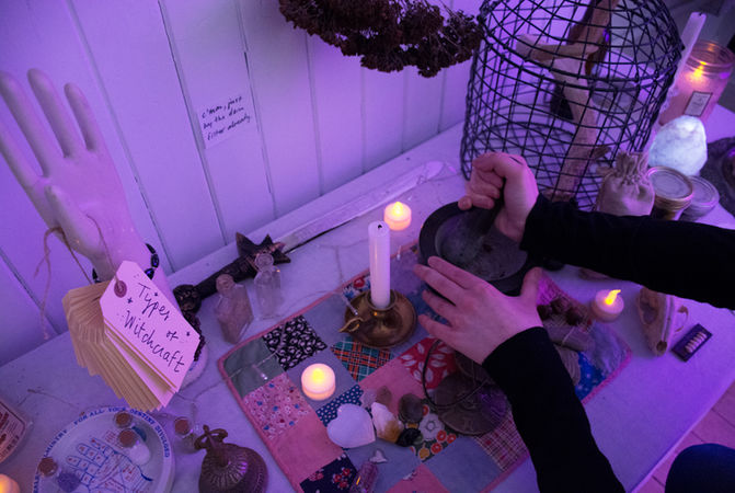 Katherine Zawadzki's Capstone Project comes together as the public presentation of a private space – a Teen Witch’s bedroom. Often the first place over which teens have primary control, the bedroom is an extension of self that reflects interests, taste, and identity; it is made over, rearranged, painted, and purged to represent its inhabitant and her current self. The exhibit is not only visual, but also an interactive experience that aims to capture and communicate the appeal and validity of Witchcraft as a means of defining a self identity.